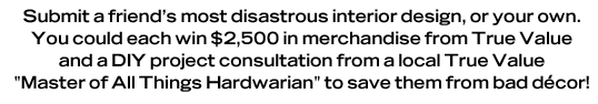 Entering is easy - submit a short entry along with a video or up to 3 photos of a friend's decorating disaster or nominate your own home improvement hang up. Whether it's a hideously wallpapered kitchen or a bathroom that was paneled in the 50's, you can help any room break free from dated design with some D.I.Y. updates and advice from the experts. And be sure to tell us which of your favorite True Value hardware stores can help you turn your design disaster around.